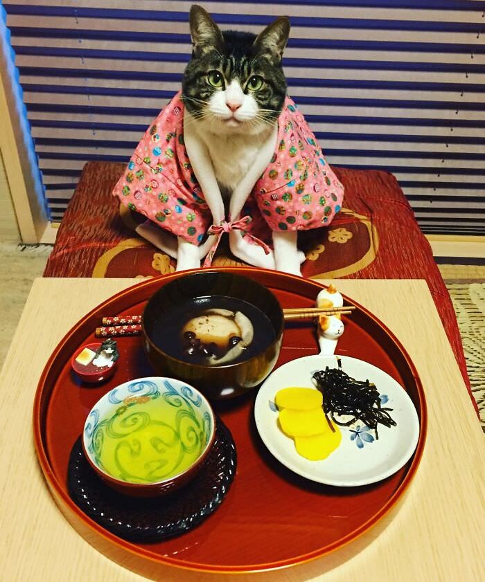Японка Риэ Мацуи (Rie Matsui), увлекающаяся фуд-фотографией, одевает своего питомца, кота по кличке Маро, в разные наряды, чтобы поужинать вместе, и не забывает каждый раз сфотографировать его в новом образе.