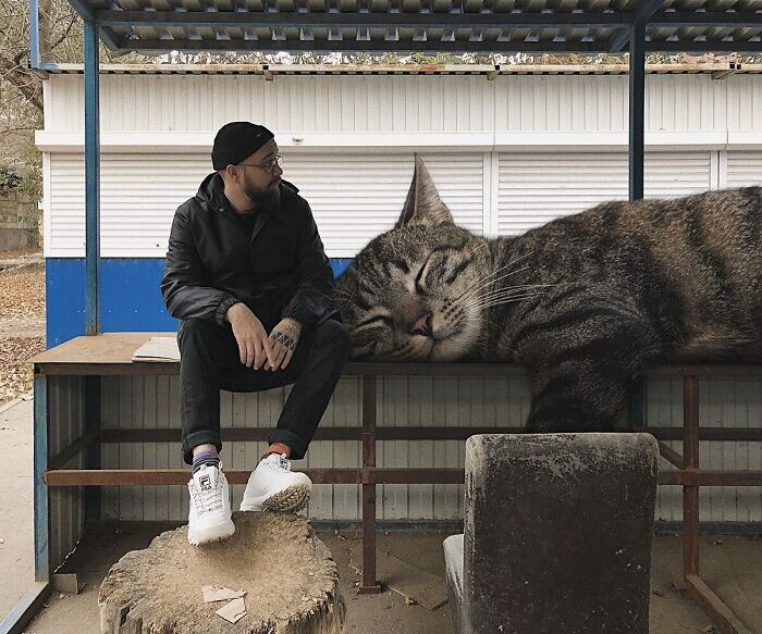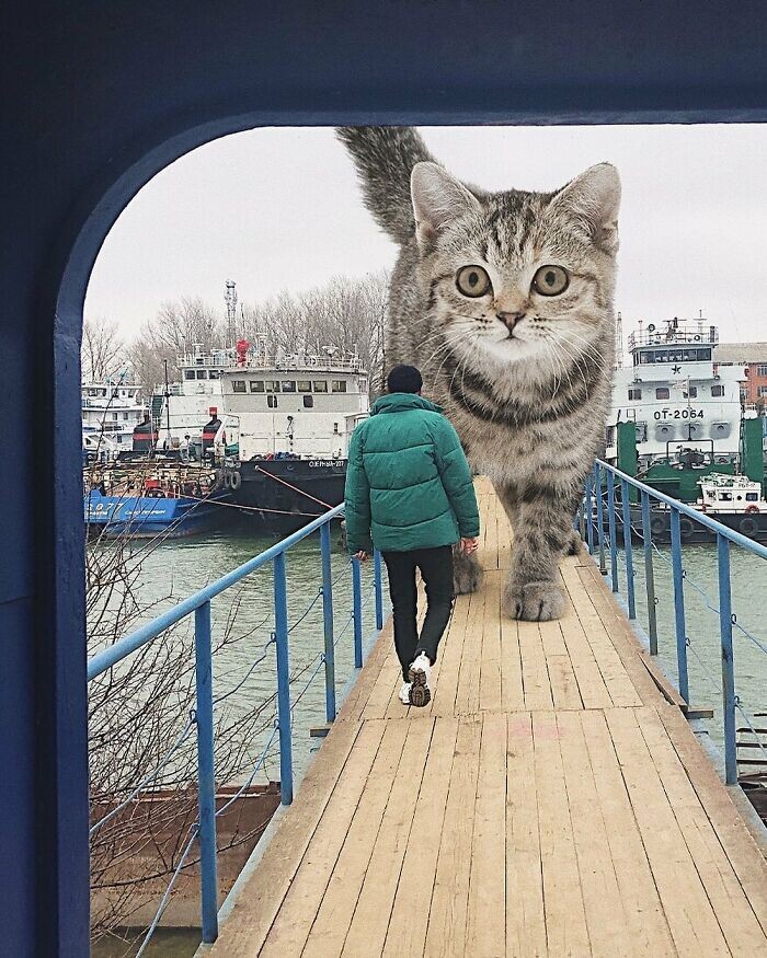 Несколько лет назад художник Андрей Щербак из Ростова-на-Дону приятно удивил нас своими огромными котами, добавленными в фотографии (в этом посте). По сей день он продолжает исследовать мир, населённый гигантскими кошками, и сегодня мы хотим показать вам его новые работы.