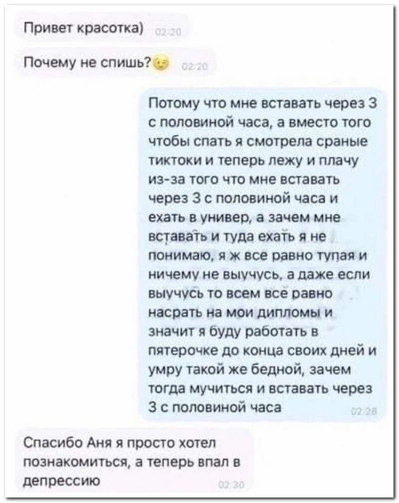 Прикольные комментарии и СМС-диалоги (22 фото) 29 ноябрь 2022 324 фото приколы 0 Представляем вам очередную порцию скриншотов из социальных сетей и мессенджеров с прикольными комментариями и СМС-диалогами, которые вызовут улыбку и поднимут настроение! запостил(а) admin Вернуться назад 0 Смотрите также Смешные комментарии и СМС-диалоги (27 фото) Прикольные комментарии из соцсетей (21 фото) Смешные комментарии из социальных сетей (18 фото) Смешные комментарии и СМС-переписка (15 фото) Прикольные комментарии и СМС-диалоги (20 фото) А что там на главной? ))) Прокомментировать Введите код с картинки: Отправить Комментарии (0)