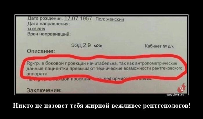 Прикольные демотиваторы на Бугаге (18 шт) 06 февраль 2023 257 фото приколы 0 Свежая порция демотиваторов на любой вкус и обо всём на свете!Сегодня в выпуске: про вежливых рентгенологов, про зонт толкиениста, про самостоятельные поиски принца, про авокадо-альбинос и многое другое! запостил(а) admin Вернуться назад 0 Смотрите также Демотиваторы-приколы (13 шт) Свежие демотиваторы на Бугаге (14 шт) Демотиваторы свежие, прикольные (14 фото) Свежих демотиваторов порция (14 фото) Прикольные демотиваторы для всех (15 фото) А что там на главной? ))) Прокомментировать Введите код с картинки: Отправить Комментарии (0)